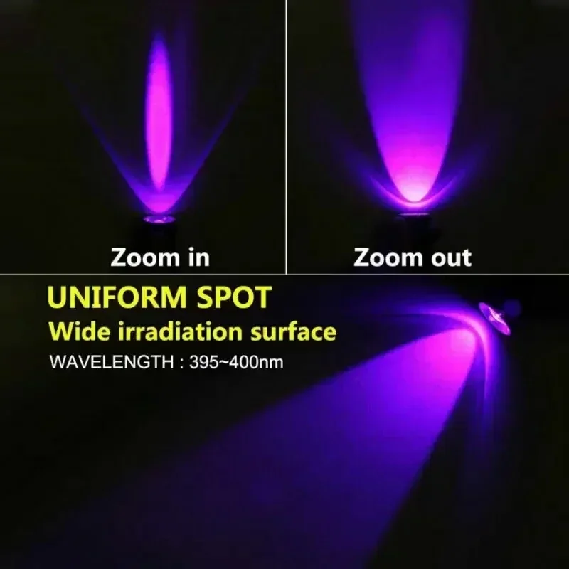 395NM UV Flashlight: Effectively detects stains, fungi in food, and counterfeit currency. Ideal for use in cars, on minerals, and for finding scorpions.