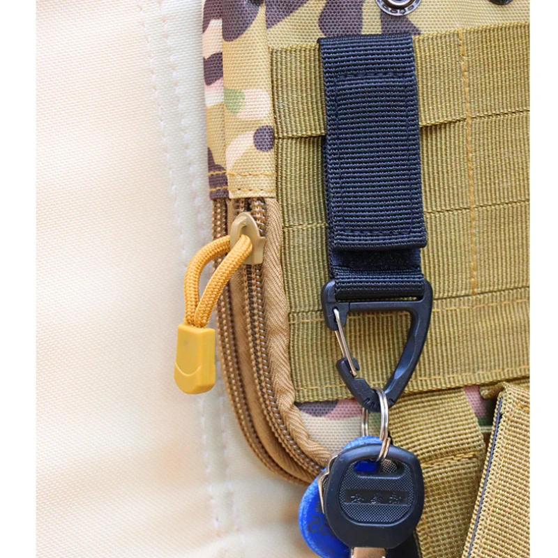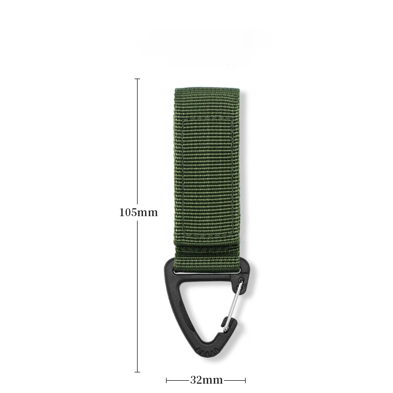 This multi-functional outdoor tactical backpack carabiner is designed for camping and climbing enthusiasts. It features a durable nylon construction and a strong plastic steel triangle hanging buckle, making it an essential accessory for anyone looking to enhance their gear with a reliable MOLLE system attachment.