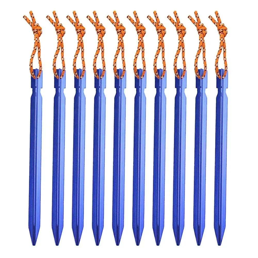 These heavy-duty aluminum alloy outdoor garden stakes are designed for securing tents and shelters during camping, backpacking, and hiking. With a unique three-sided shape, they provide a strong grip in various soil types, ensuring your tent stays firmly in place. Lightweight and portable, these stakes are easy to carry and store, making them an essential accessory for outdoor adventures.