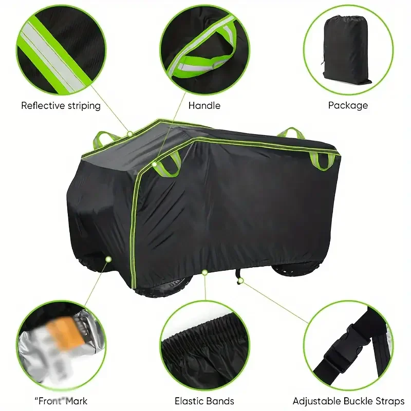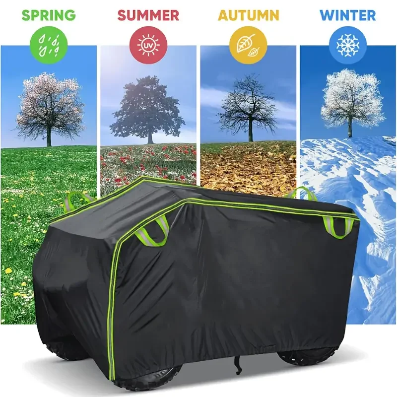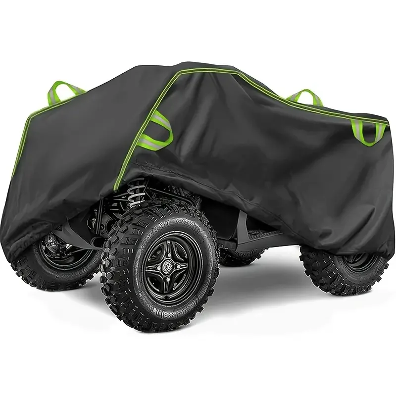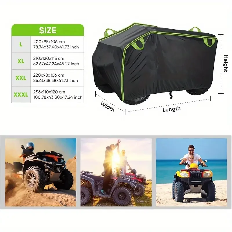 This all-weather motorcycle cover provides excellent protection against dust, water, rain, and UV rays. Made from tear-resistant Oxford fabric, it is designed to fit various four-wheelers securely.