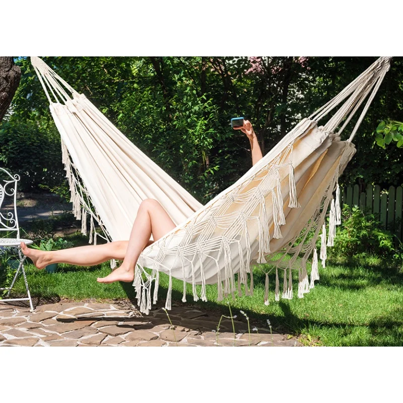 This large hammock is designed for two people, featuring a beautiful Basimakra tassel and fish tail knit design. Perfect for outdoor camping, relaxing on the terrace, or enjoying your balcony, this hammock provides a comfortable resting space wherever you are.