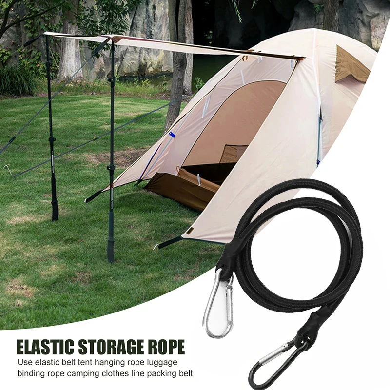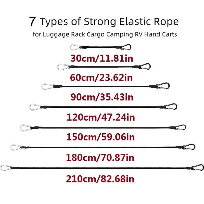 30-210cm Outdoor Elastic Rope with Black and Silver Hooks is a lightweight and versatile solution for luggage bundling and tent setup.