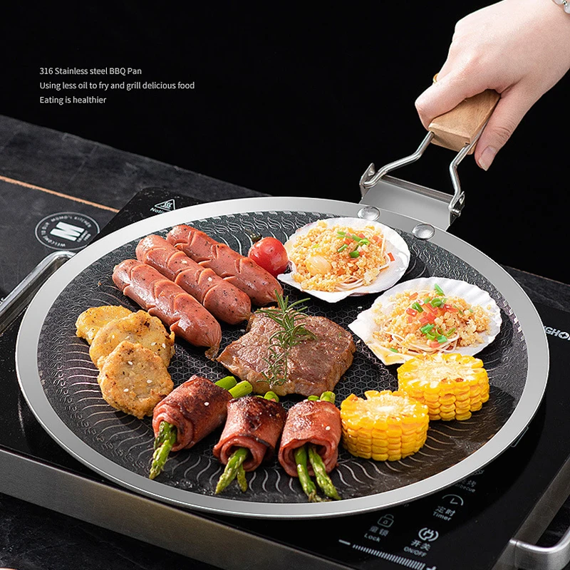 This 34/38CM Outdoor BBQ Grill Pan is designed for versatile cooking, whether you’re at home or enjoying a camping trip. Made from durable 316 stainless steel, it features a non-stick surface that ensures easy food release and cleaning.