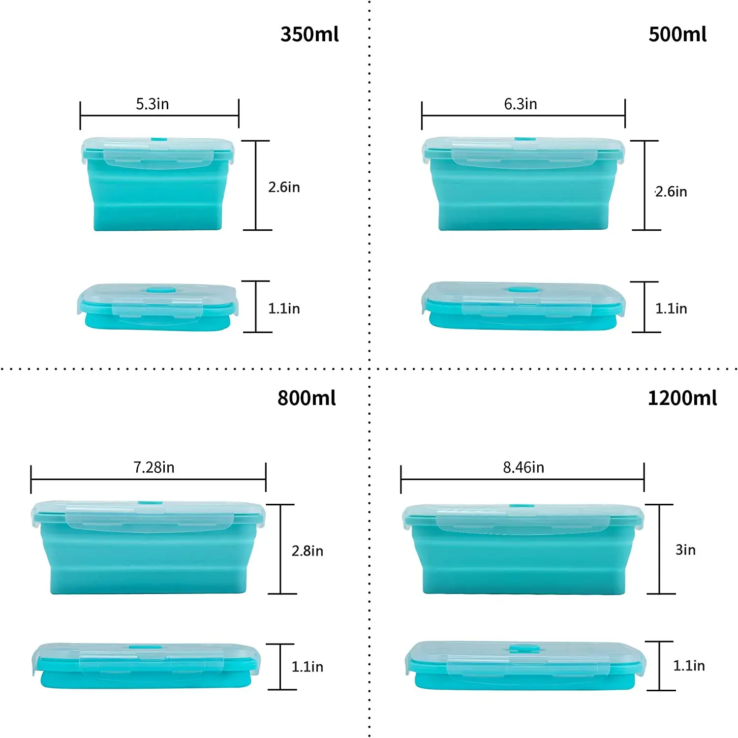 - Each container comes in a different size: 350ml (approximately 13.5 x 10 x 6.6 cm), 500ml (approximately 16 x 10.5 x 6.8 cm), 800ml (approximately 18.5 x 12 x 7 cm), and 1200ml (approximately 21.5 x 13.5 x 7.6 cm). When collapsed, they are only about 3 cm tall, saving valuable storage space.