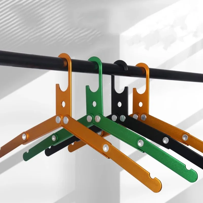 Aluminum foldable portable hangers are perfect for business trips and outdoor adventures. These ultra-light non-slip hangers are designed for easy transport and efficient use while traveling or camping.