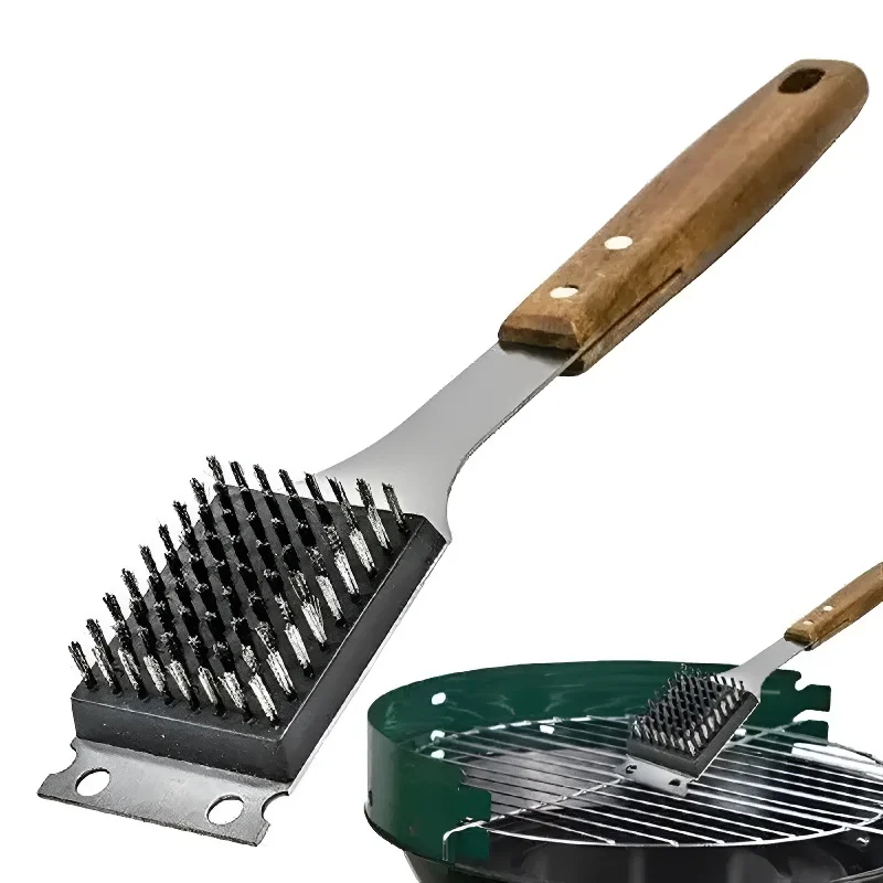 This grill brush is designed for effortless cleaning of outdoor grills. With its extended wooden handle and durable stainless steel bristles, it effectively removes burnt-on residue, making it an essential tool for any grilling enthusiast.