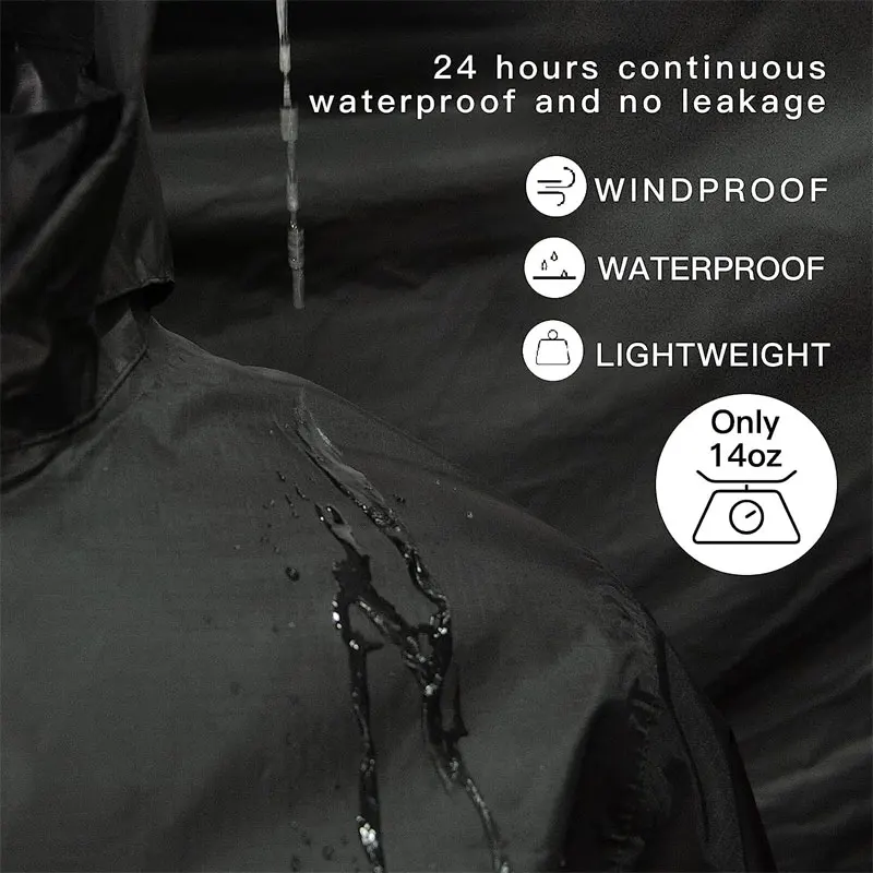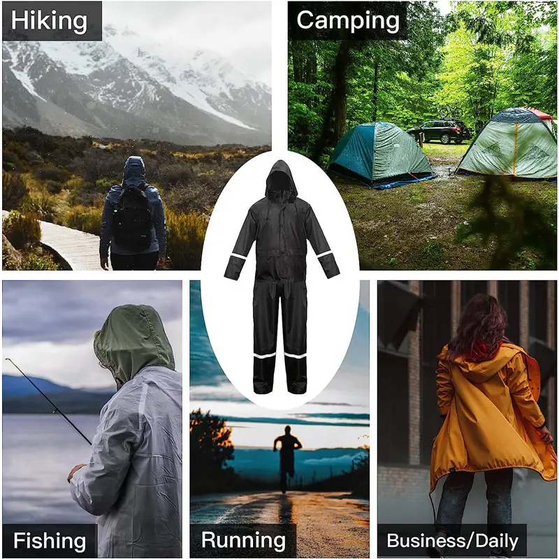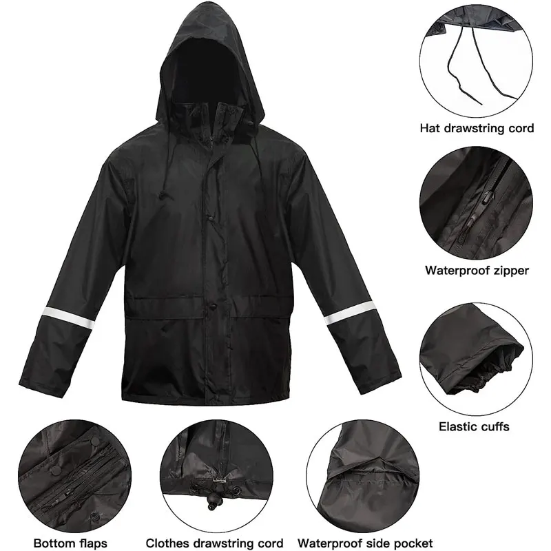 This black raincoat with reflective strips is designed for men who need reliable protection from the rain during outdoor activities. It is suitable for various uses such as fishing, hiking, and other work in wet conditions.