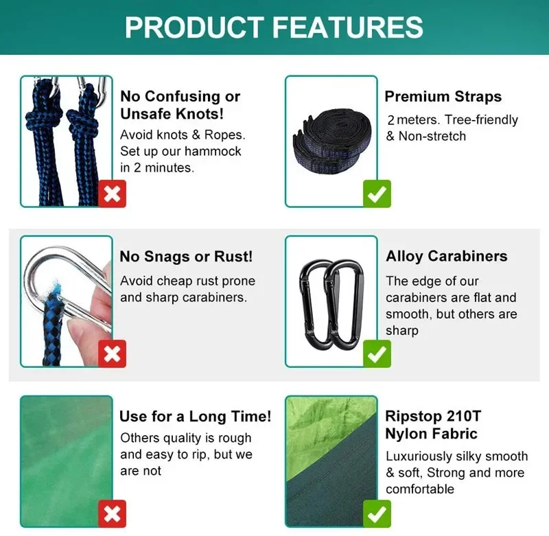 This camping hammock is designed for comfort and convenience, making it an ideal choice for outdoor enthusiasts. It is made from durable nylon material, ensuring it can support up to 500 lbs. Perfect for camping, hiking, or relaxing in your backyard, this hammock is lightweight and easy to carry.