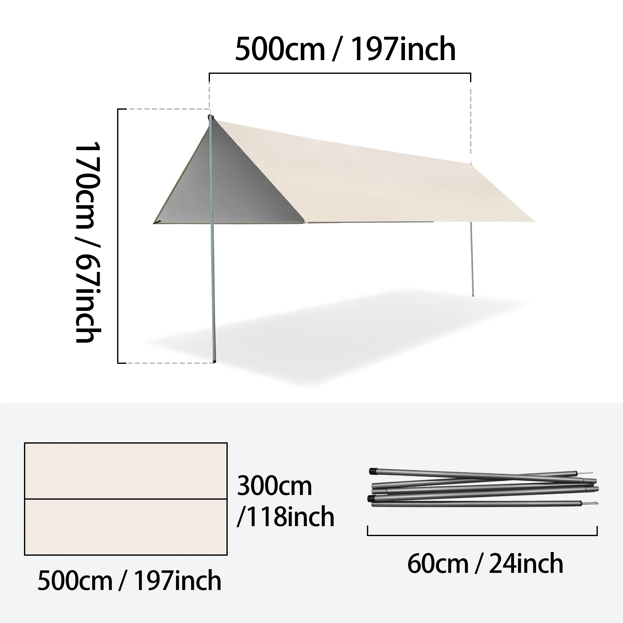 - Package includes: 1 tarp, 2 poles, and necessary accessories
