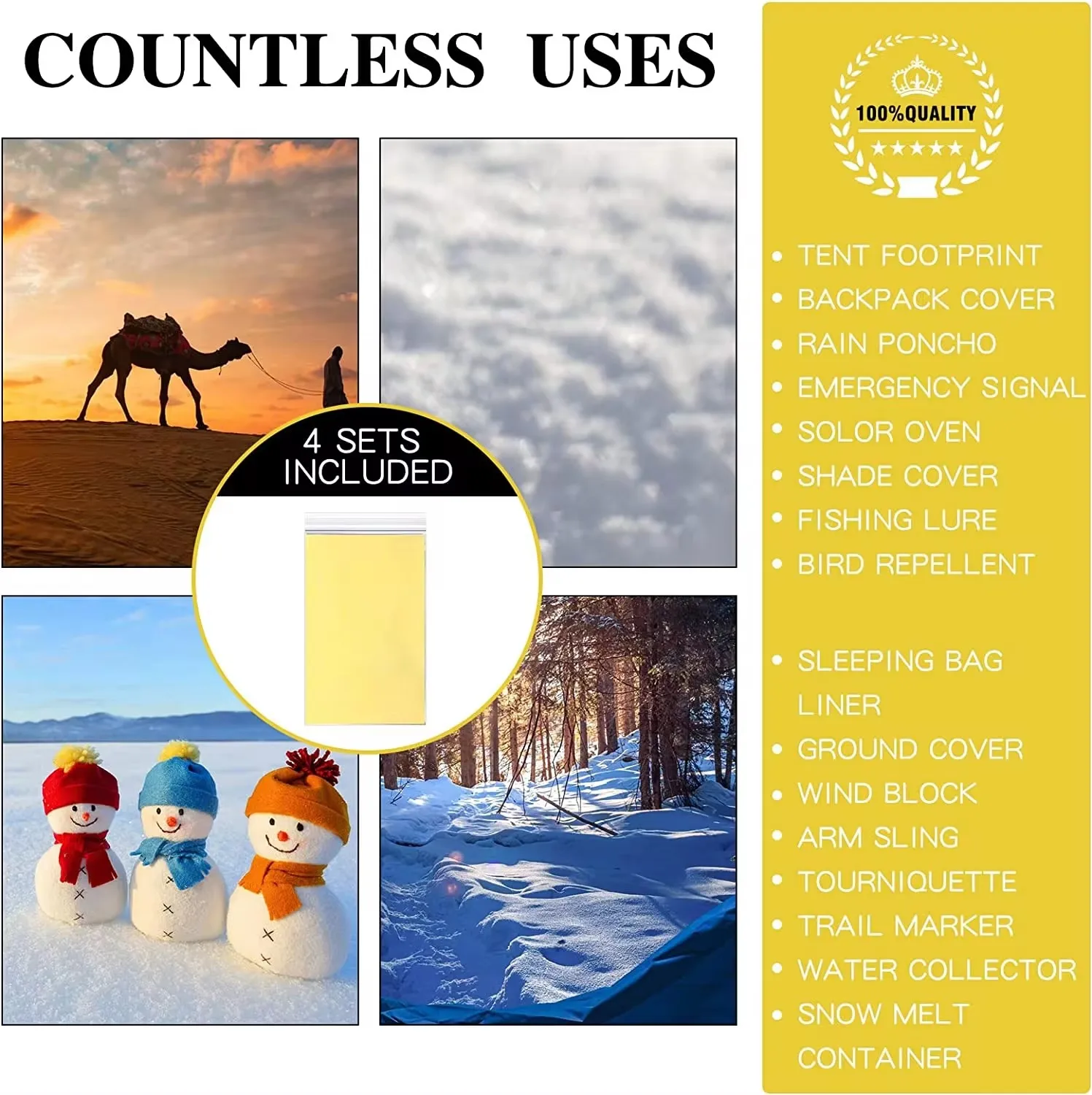 - The first aid blanket can serve as a reflective film to signal rescuers.