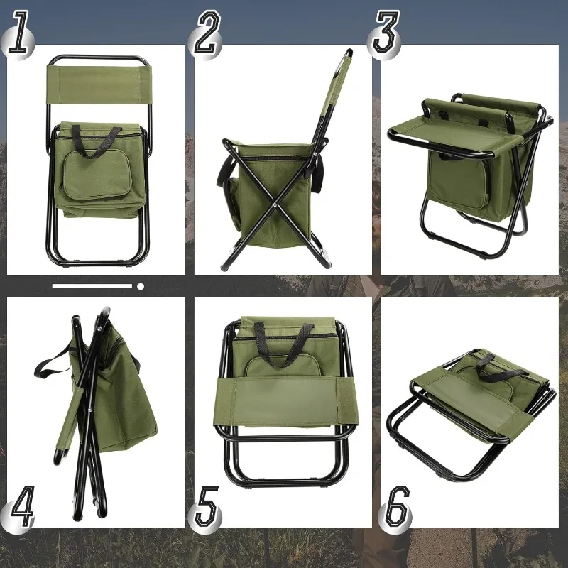 This foldable fishing chair is perfect for outdoor enthusiasts, offering comfort and convenience for fishing trips or camping. It features a built-in cooler bag to keep your drinks and snacks cool while you relax. The chair is lightweight and portable, supporting up to 220 lbs, and includes a backrest for added comfort.