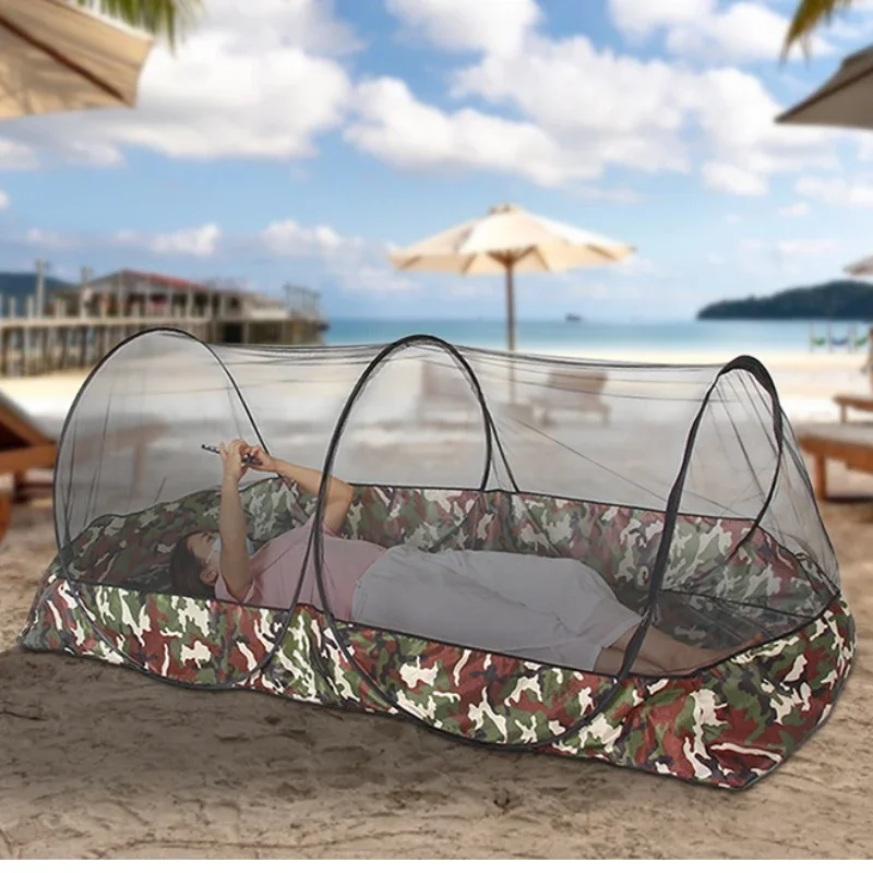 This folding portable mosquito net is designed for outdoor use, making it ideal for camping trips, picnics, and single bed setups. It features a convenient zipper for easy access and is made from breathable mesh to keep insects out while allowing airflow.