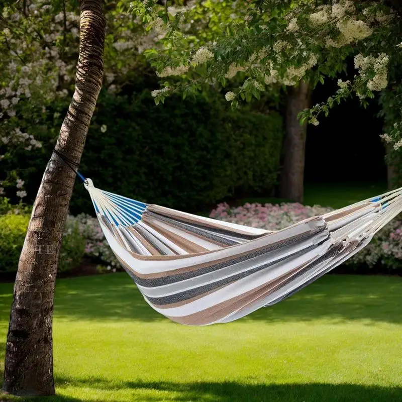 Enjoy the great outdoors with our spacious two-person tree hammock, designed for comfort and relaxation. This striped hammock is perfect for camping trips or lounging in your backyard, providing a cozy space for you and a friend to unwind.