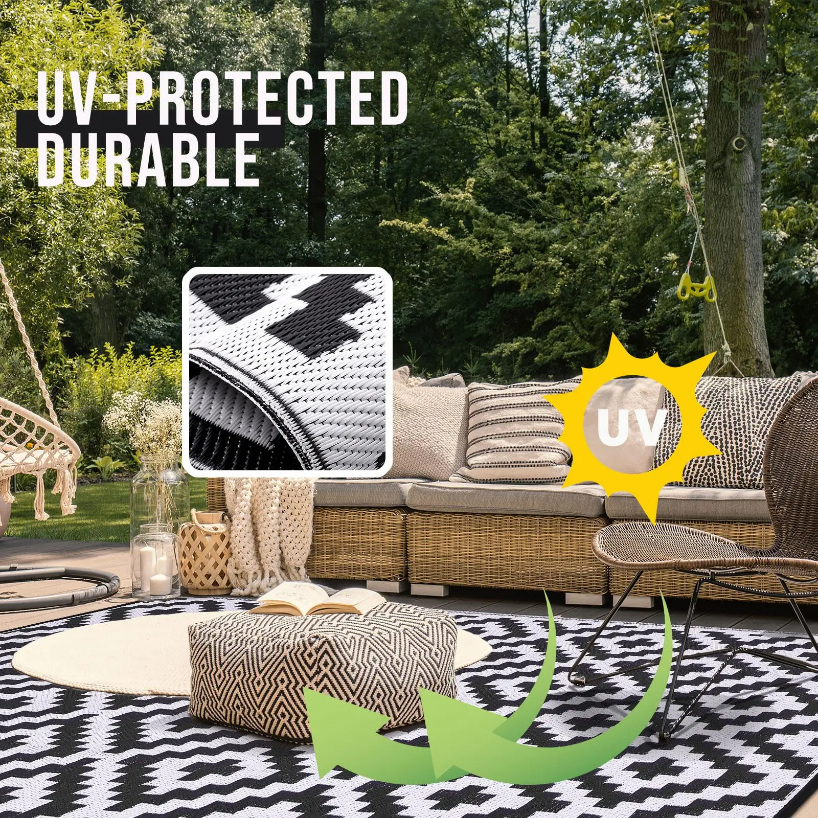 - Fade-resistant: Coated for UV protection, this rug maintains its colors even in direct sunlight, ensuring long-lasting use.
