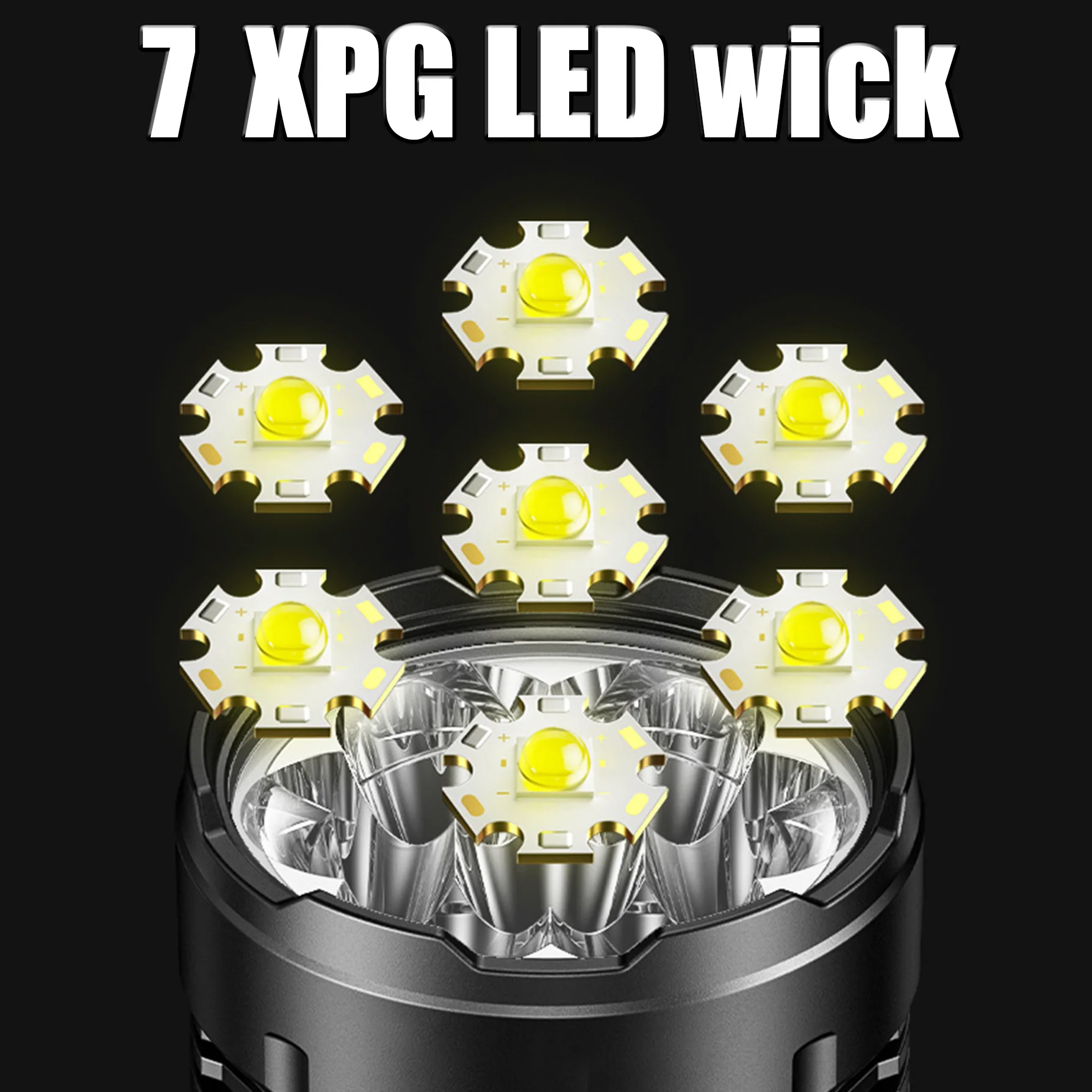 - 7 Upgraded XPG Wicks: Arranged in a circular pattern to create a petal-shaped floodlight effect, illuminating up to 1500 meters ahead with a lighting area of approximately 500 square meters.