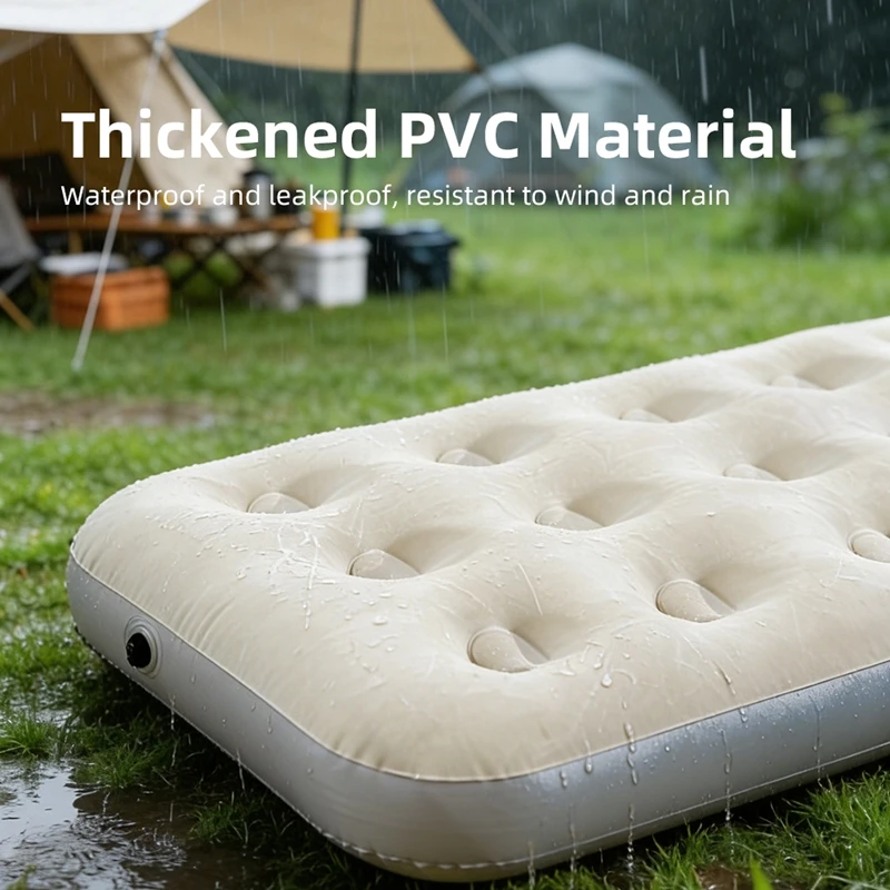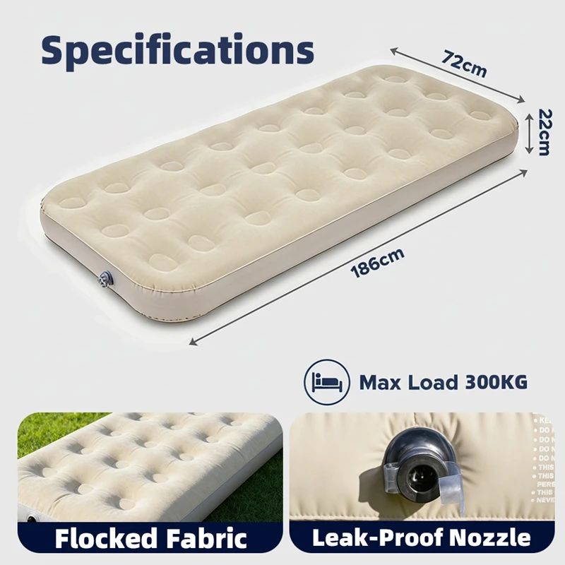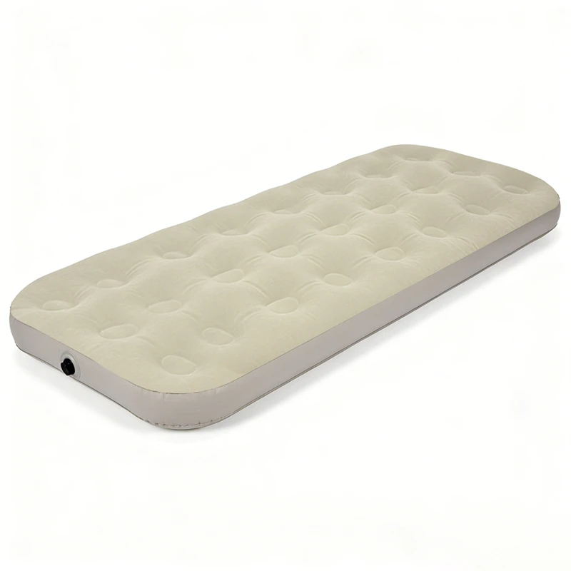 The PVC flocked air mattress offers comfort and convenience for both indoor and outdoor use. Its soft, velvety surface ensures a cozy sleeping experience, making it ideal for camping, guests, or relaxing at home. Available in four different sizes, you can choose the one that best fits your needs.