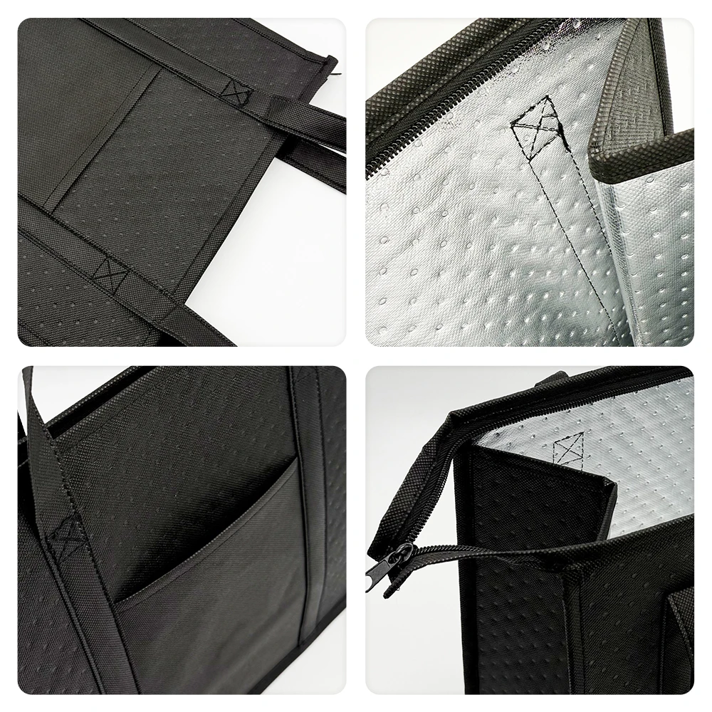 This large insulated reusable grocery bag features a zipper and a front pocket, making it ideal for various activities such as camping, picnics, fishing, and shopping. It is designed to keep your items cool or warm for several hours, providing convenience and functionality.