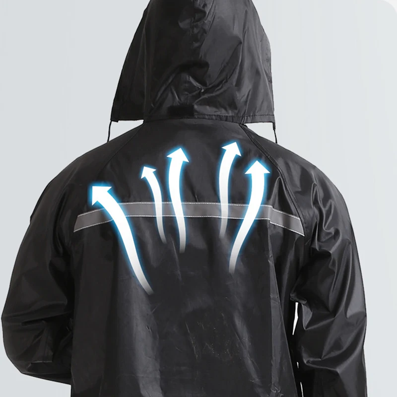 This two-piece raincoat and rain pants set is designed for electric motorcycle delivery rides, providing full-length protection against rain. It is suitable for adults and ensures comfort and safety during use.