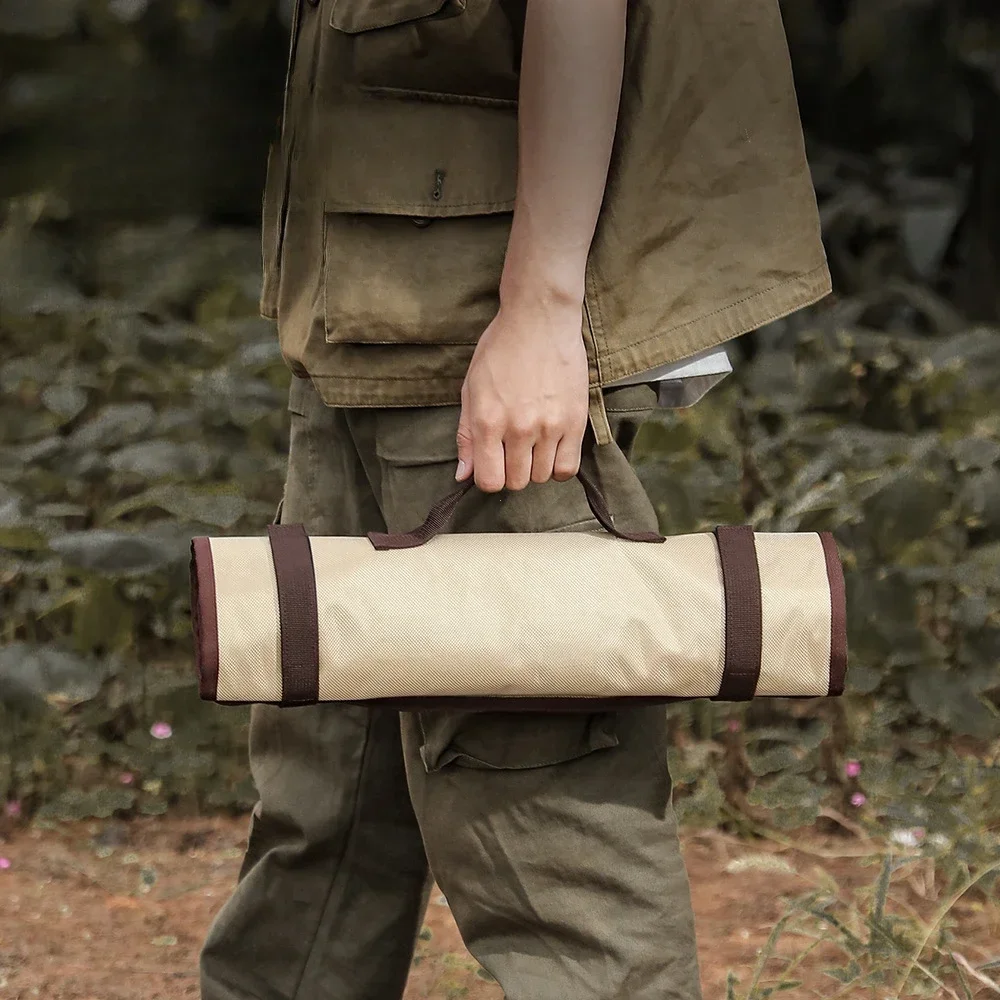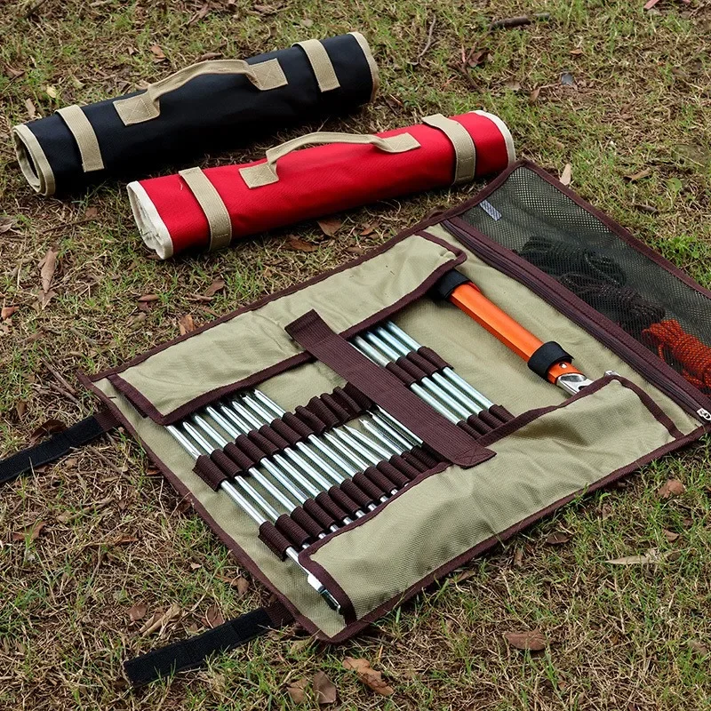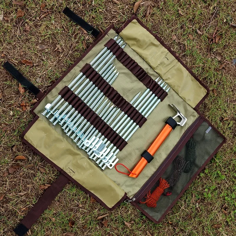 This outdoor camping storage pouch is designed to keep your camping gear organized and easily accessible. It is perfect for storing essential tools like tent pegs, a hammer, and other outdoor supplies.