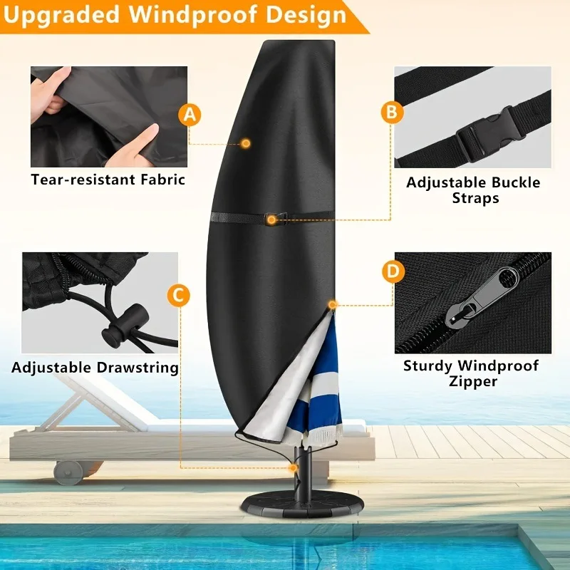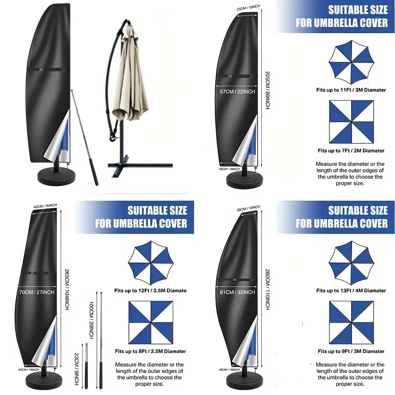 This outdoor umbrella cover is designed to provide comprehensive protection for your cantilever sunshade. It is made from durable materials that ensure your umbrella remains safe from the elements, including UV rays, rain, and dust.