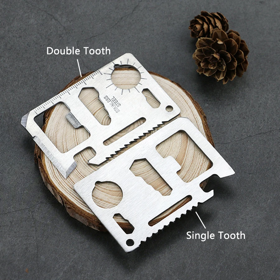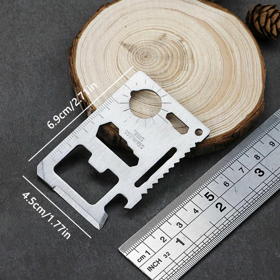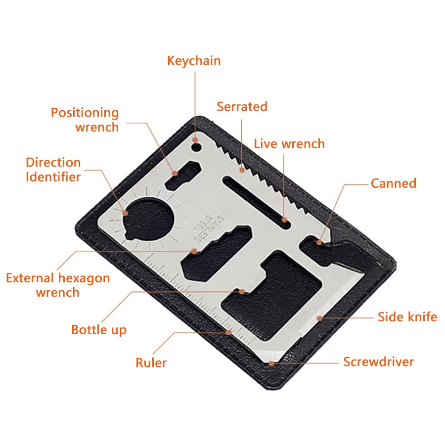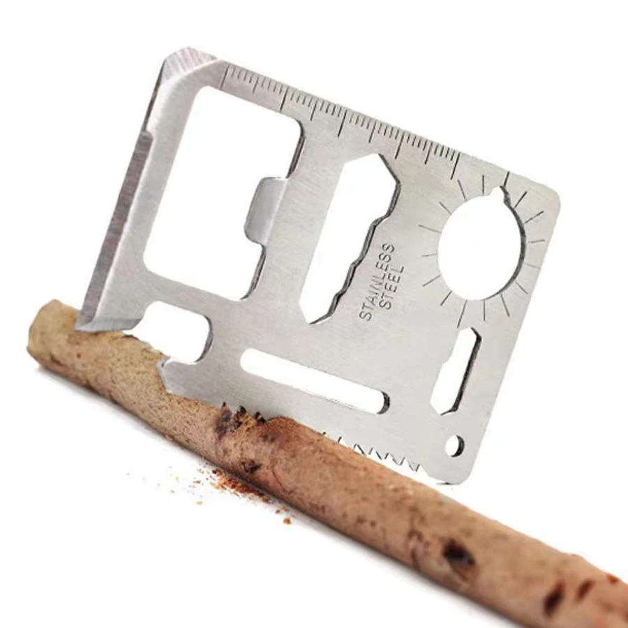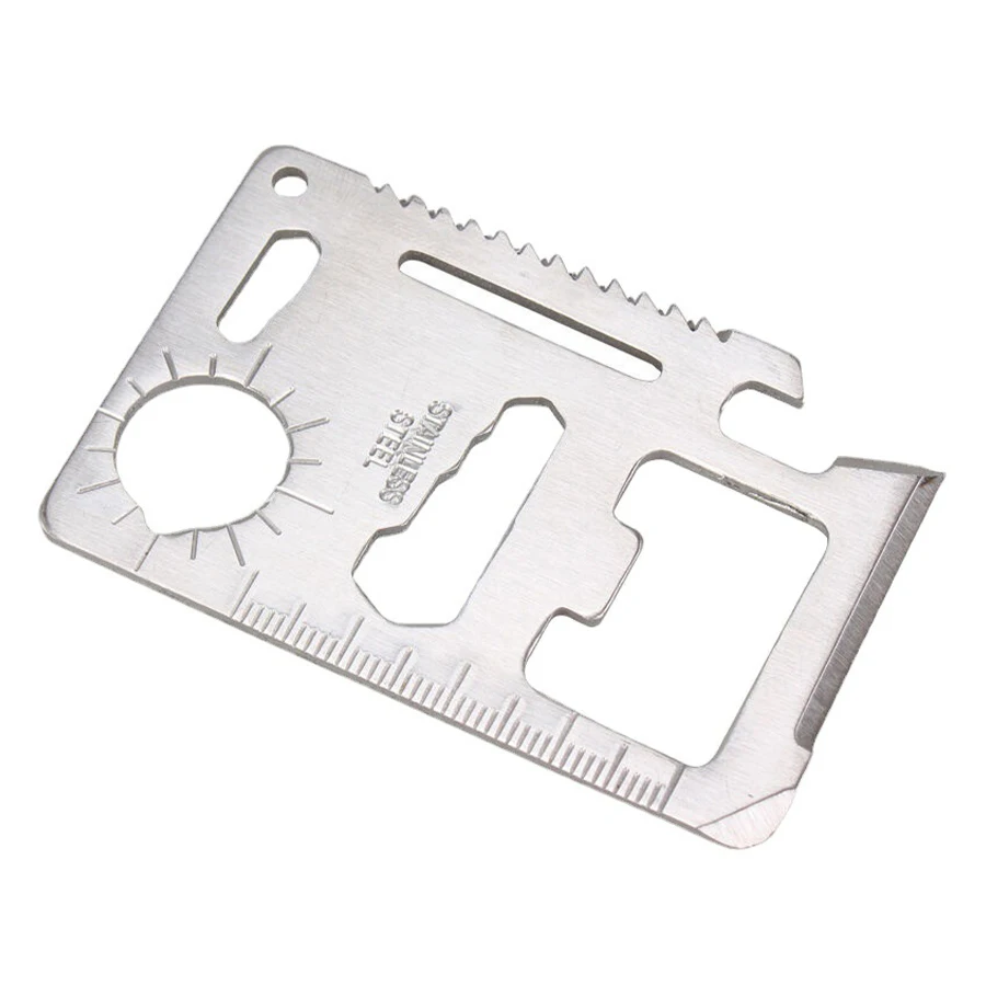 This multifunctional outdoor tool is designed for survival and convenience. It combines various essential features into a compact card-sized gadget, making it perfect for camping, hiking, and other outdoor activities. With its durable construction, this tool is a reliable companion for any adventure.