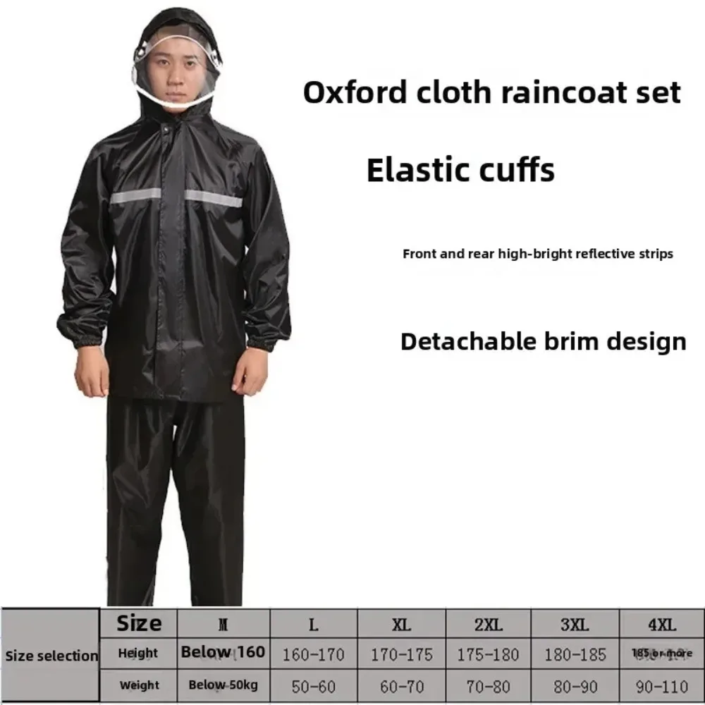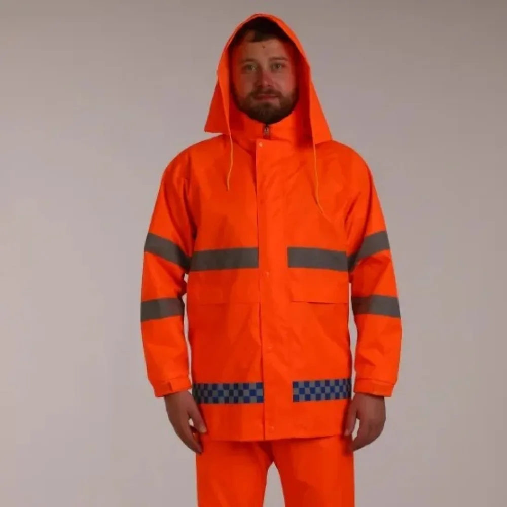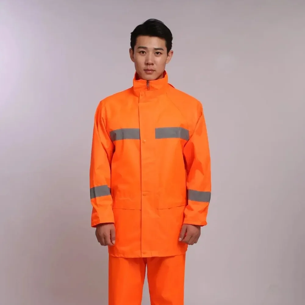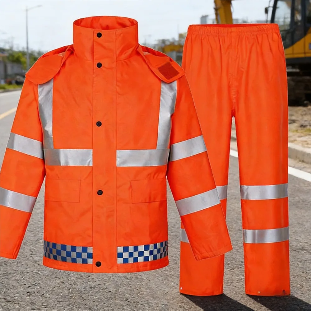 This waterproof rain suit set includes a raincoat and pants, designed for work, traffic duty, cycling, and patrol activities. It features reflective elements for enhanced visibility in low-light conditions, making it suitable for various outdoor tasks.
