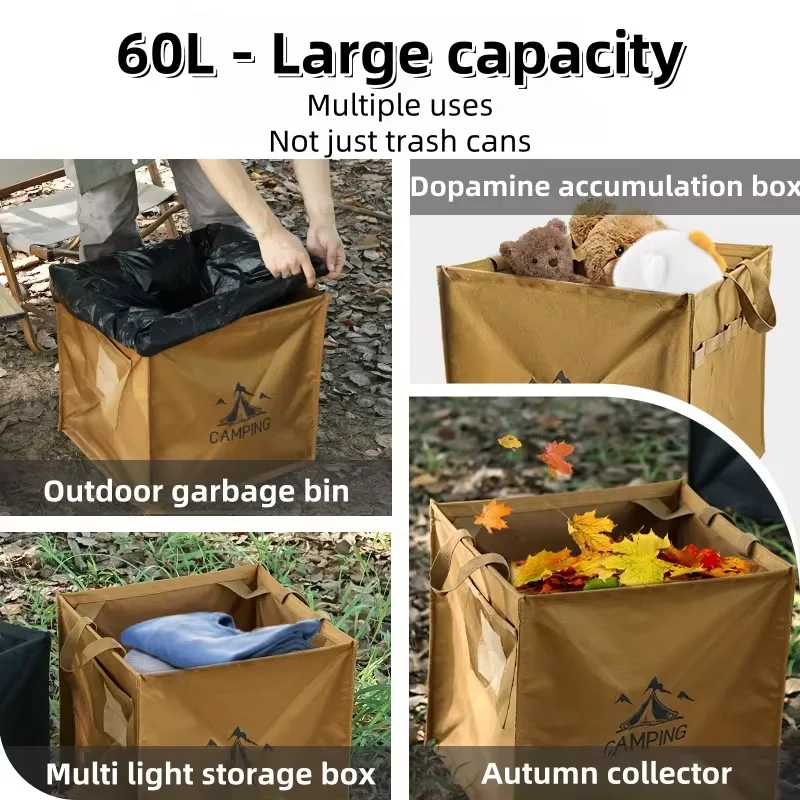 This outdoor folding garbage bin is designed for camping and hunting, providing a convenient storage solution with a large capacity. Its compact design allows for easy transport and setup, making it an essential piece of equipment for outdoor enthusiasts.