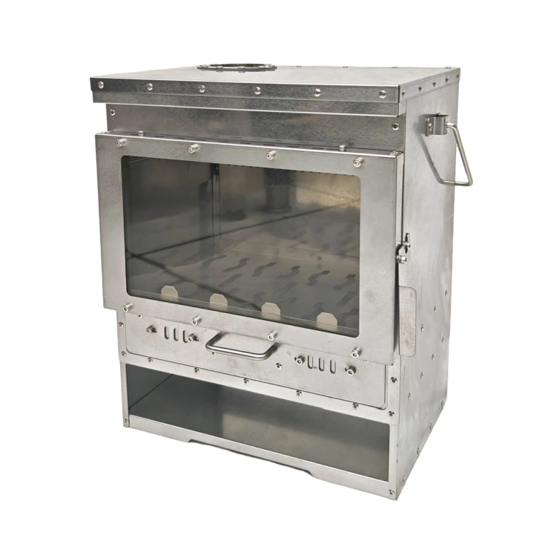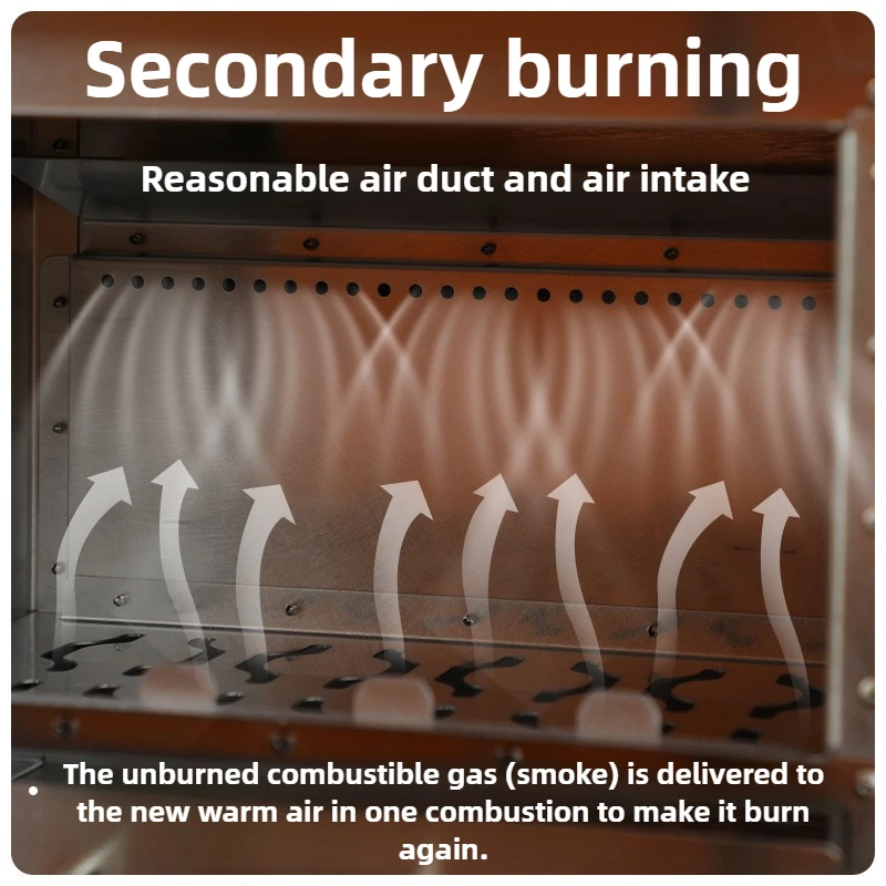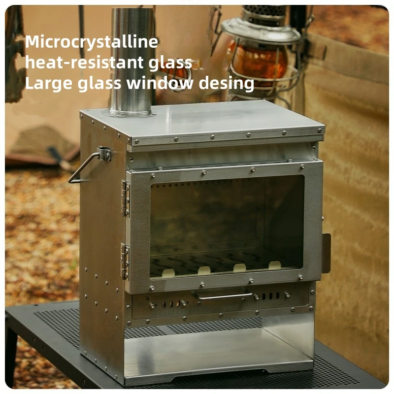 This outdoor wood stove is designed for heating and features a large glass window for viewing the fire. It is suitable for secondary combustion, making it an efficient choice for outdoor heating needs.