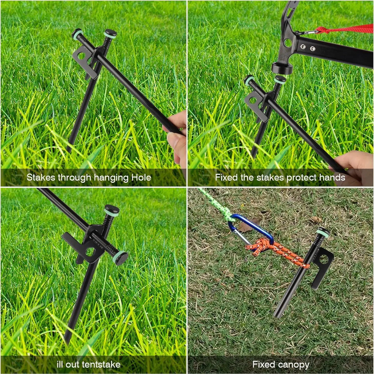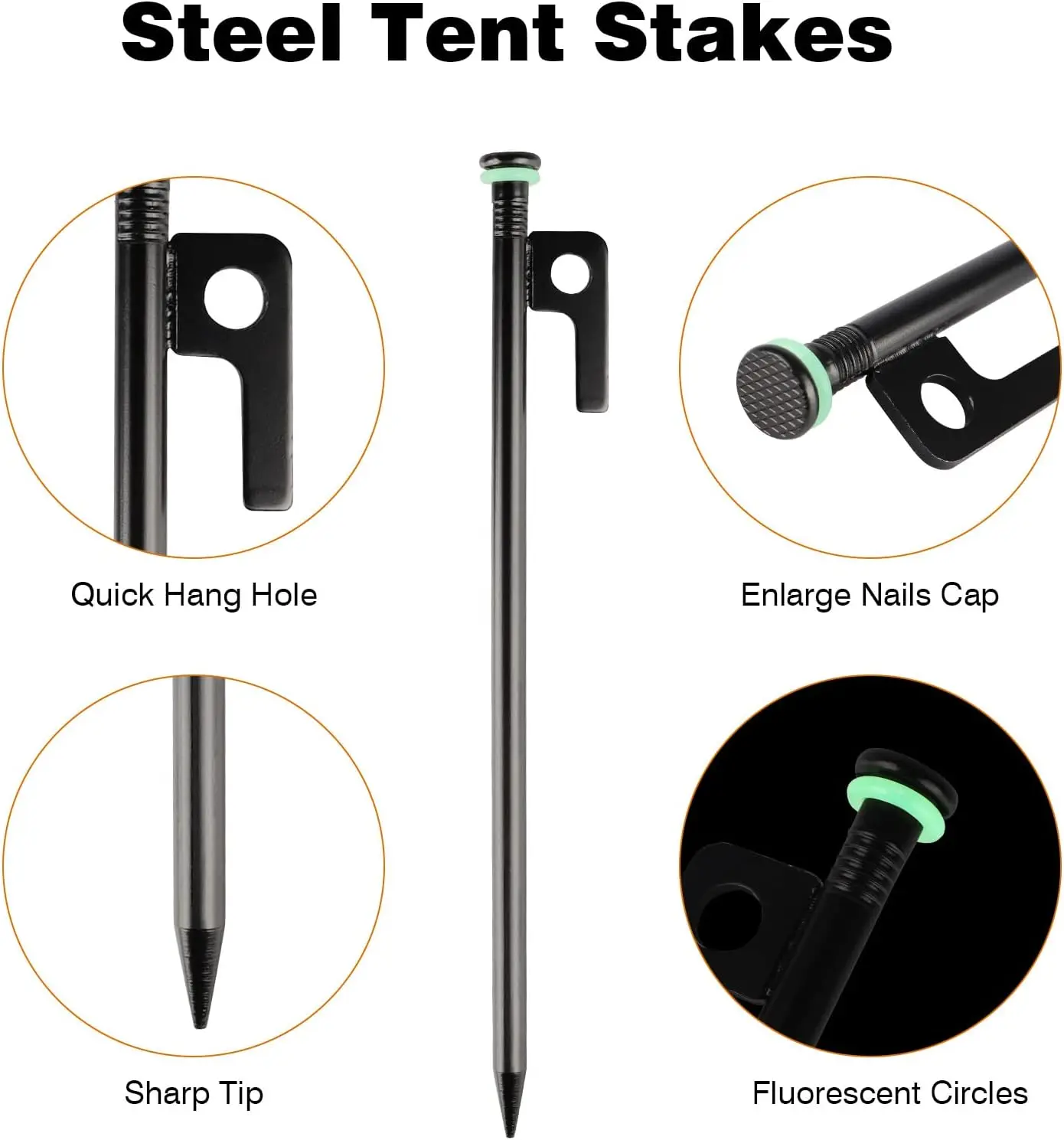 These heavy-duty metal tent stakes are designed for secure anchoring during your camping trips. Made from durable steel, they are suitable for use on rocky ground and come with fluorescent silicone rings for easy visibility. Each stake is built to withstand the elements, ensuring your tent remains stable and secure throughout your outdoor adventures.
