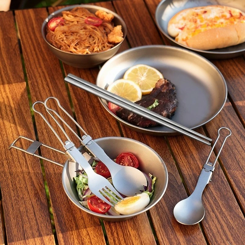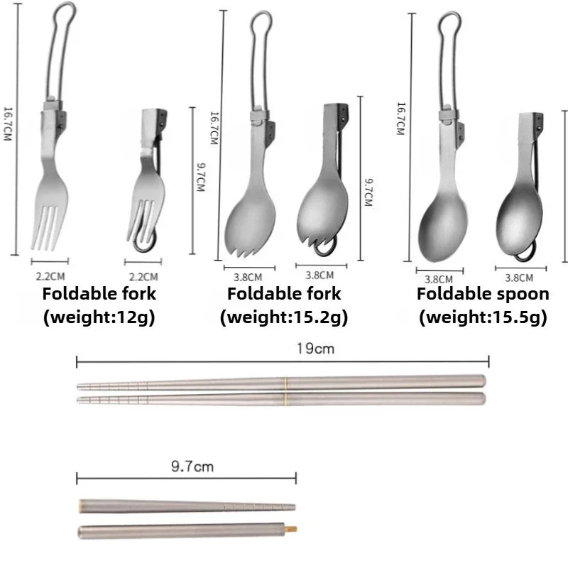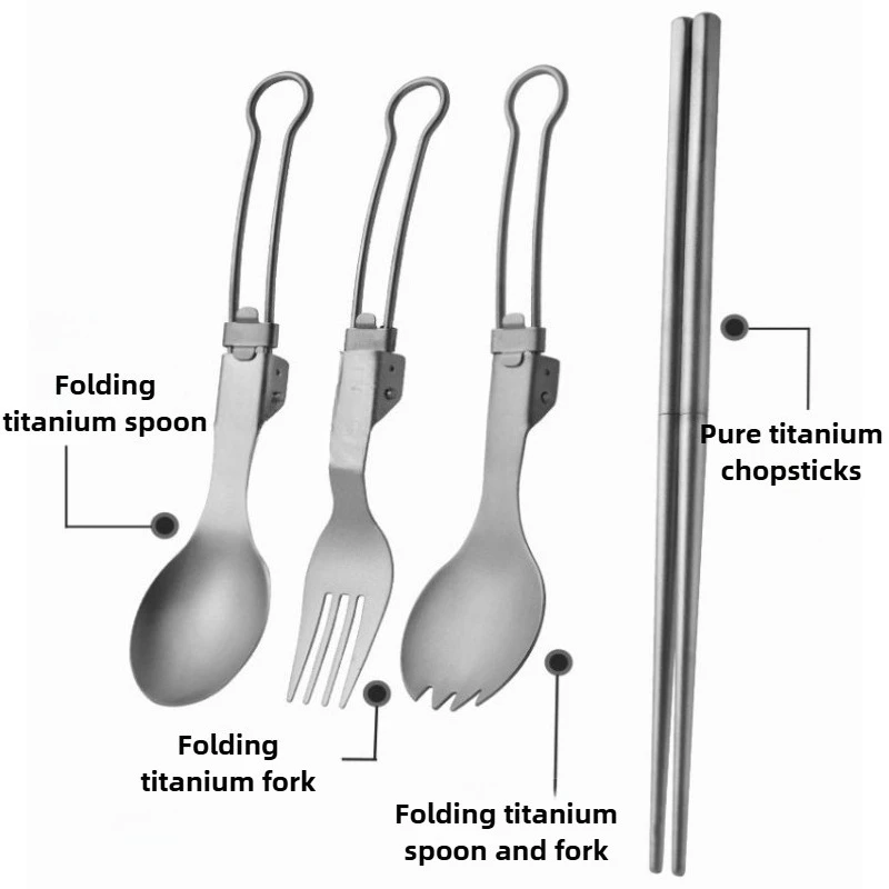 This foldable titanium camping spork set is designed for outdoor enthusiasts who need lightweight and durable cutlery. Perfect for camping, hiking, and picnics, this versatile set includes a fork, spoon, and chopsticks, all made from high-quality titanium.