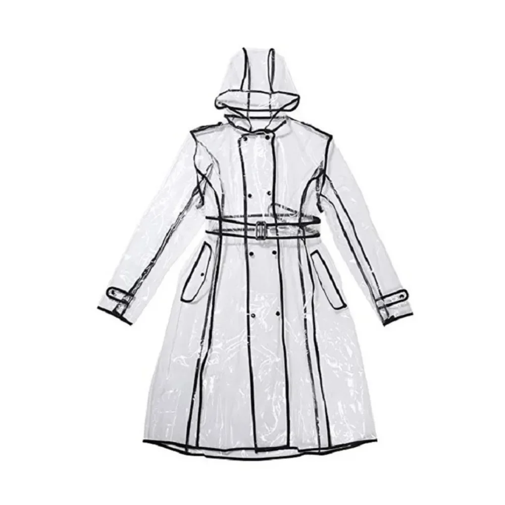 This transparent raincoat is designed for both men and women, featuring a stylish hood and a belt for a fashionable look. It is perfect for keeping you dry during unexpected rain showers while maintaining a trendy appearance.