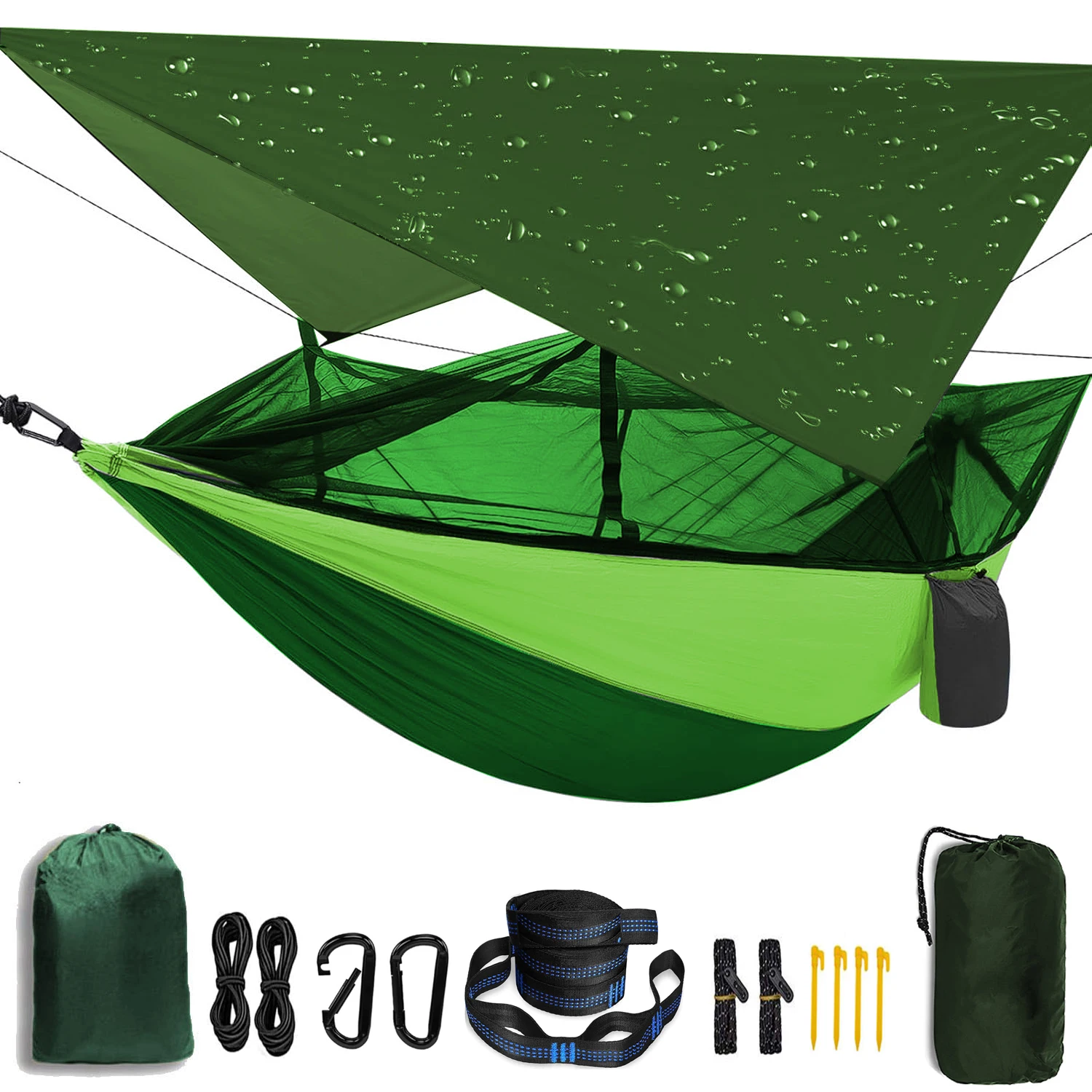 • Complete System: The package includes everything you need for a comfortable outdoor experience, including a hammock with a mosquito net and a rain fly tarp.